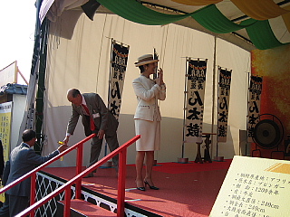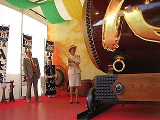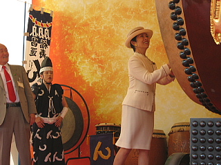平成17年4月28日(木) 午後4時頃、名古屋城博へ高円宮(たかまどのみや)妃 久子さまがご来場され、「ん太鼓」をお打ちいただき、記念の演奏と、破魔矢を献上しました。