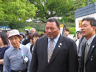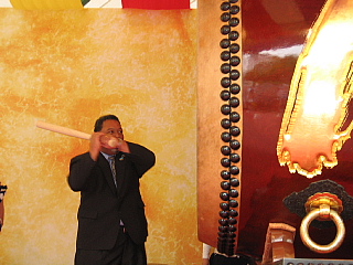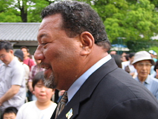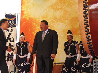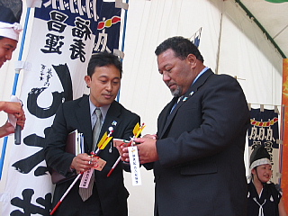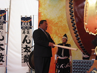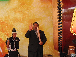 平成17年4月29日(金) 午後4時頃、名古屋城博へミクロネシアのウルセマル大統領が来場され、演奏を聴かれた後、「ん太鼓」をお打ちいただき、記念の破魔矢を差し上げました。また、破魔矢に大統領のサインをしていただきました。