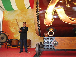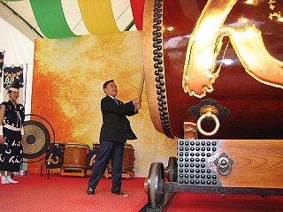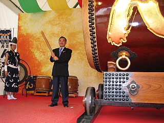 平成17年6月1日(水) 名古屋城博へカンボジア駐日大使ご一行様が来場され、「ん太鼓」をお打ちいただき、記念の破魔矢を差し上げました。また、破魔矢にサインをしていただきました。