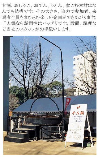 イベント企画に話題性をプラス。参加者全員をまき込む千人鍋。百人、二百人用もあります。どうぞご利用下さい。
