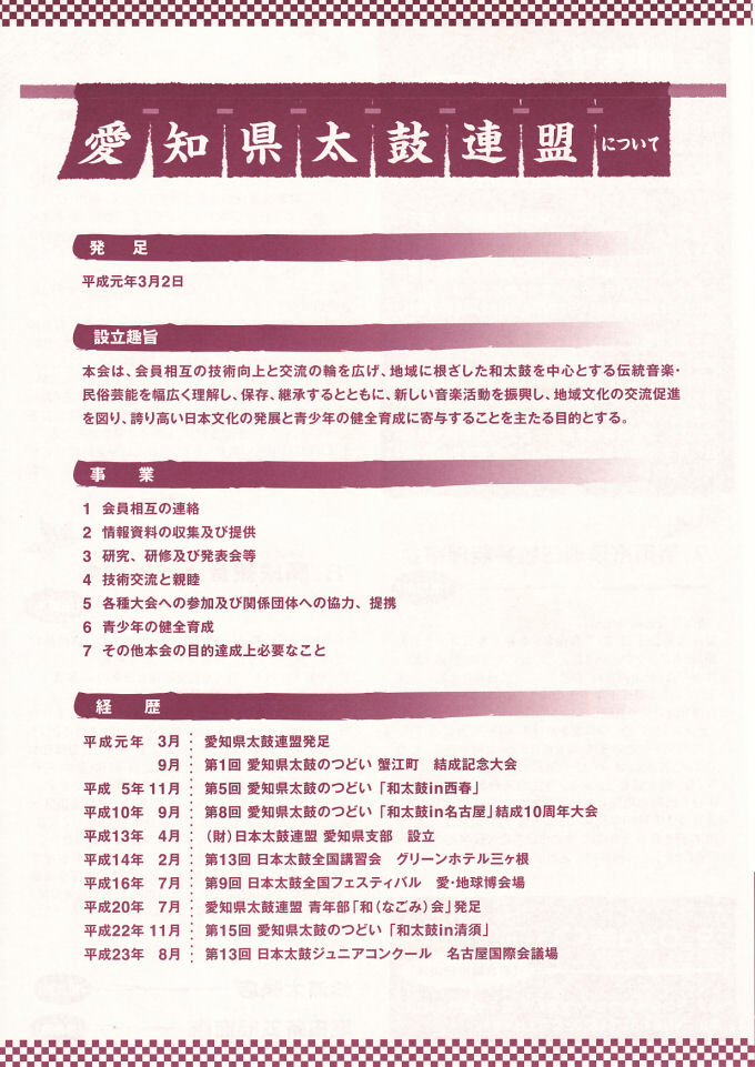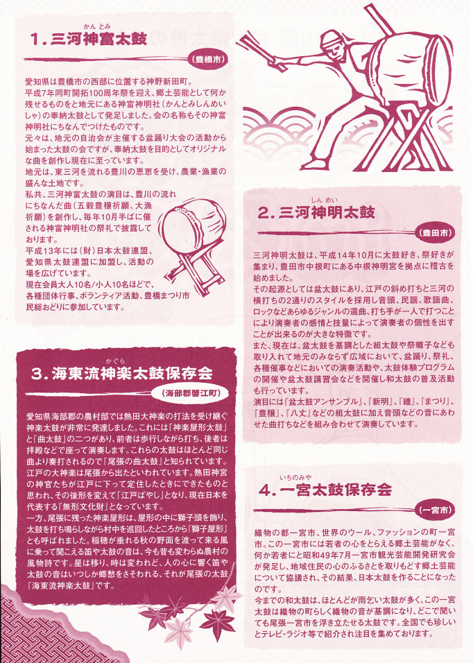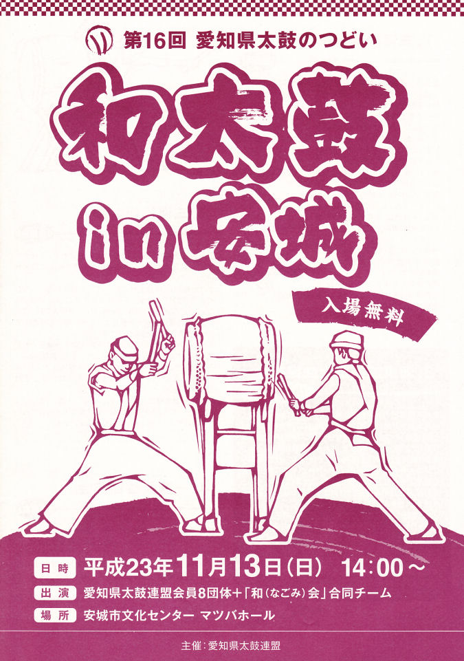 平成23年11月13日(日) 14:00〜 安城市文化センター マツバホールにて、鯱龍太鼓の出演は5番目です。